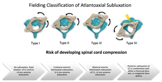 - Fielding, J.W.; Hawkins, R.J. Atlanto-Axial Rotatory Fixation. (Fixed Rotatory Subluxation of the Atlanto-Axial Joint). J. Bone Jt. Surg. Am. 1977, 59, 37–44. [Google Scholar] [CrossRef]