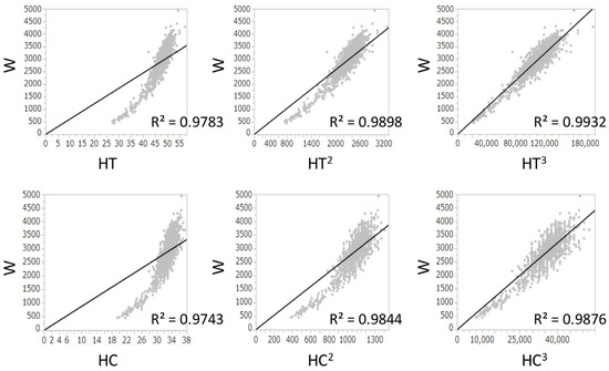 Linear regression analyses between birth weight and height, (height)2, or (height)3 and between birth weight and head circumference, (head circumference)2, or (head circumference)3 at birth. R2, coefficients of determination; HC, head circumference; HT, height; W, birth weight.