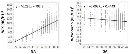 The R2 values between W and HT, (HT)2, and (HT)3 were 0.978, 0.990, and 0.993, respectively. The R2 values between W and HC, (HC)2, and (HC)3 were 0.974, 0.984, and 0.988, respectively. Because both (HT)3 and (HC)3 had the highest R2 values and had a positive correlation with W (Figure 1), (HC/HT)3 was determined as the best formula, and W was multiplied by (HC/HT)3. Because the value of W × (HC/HT)3 was dependent on the gestational age, it was divided by Wcorr. The value of W/Wcorr × (HC/HT)3 was almost the same for all gestational ages (Figure 2). Finally, W/Wcorr × (HC/HT)3 was selected as the novel physique index.