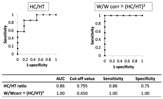 The AUC of the novel physique index was higher than that of the HC/HT ratio (1.00 and 0.86, respectively). When using the cut-off value of 0.795 for the HC/HT ratio or 0.450 for the novel physique index, the sensitivity and specificity were 0.86 and 0.75 in the HC/HT ratio or 1.00 and 1.00 in the novel physique index, respectively (Figure 3).