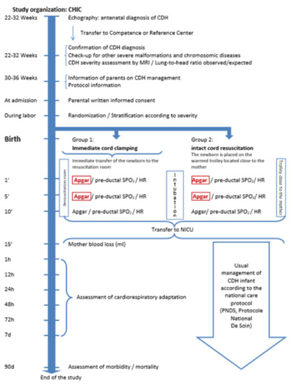 The infants with CDH will be included in the study and randomized in one of the two groups. Severity subgroups is considered as a stratified factor in randomization. A dynamic randomization procedure using the Pocock and Simon minimization method is used [22]. Whatever the group of randomization, the national guidelines [23,24] for resuscitation maneuvers in the delivery room will be applied similarly in both groups. Except the timing of cord clamping, the overall management including the resuscitation maneuvers in the delivery room (intact cord resuscitation group) or resuscitation room (early cord clamping group), and organization of the follow-up will be similar in both groups. In particular, the main resuscitation maneuvers at birth are: