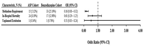Legend: This forest plot compares odds ratios for methadone requirement, unplanned extubations, and mortality between the analgosedation cohort and the benzodiazepine cohort.