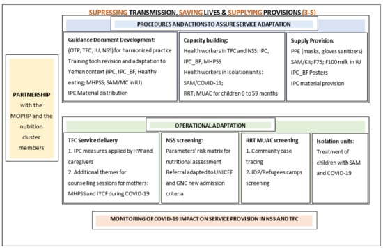 Guided by the WHO’s COVID-19 strategic operational planning guidelines to support country preparedness and response [1] where the major pillars of COVID-19 preparedness and response were outlined, a strategic framework was developed for the adaptation of the nutrition program in Yemen. Building on partnership with MOPHP and the nutrition cluster members in Yemen, the plan outlined the priority nutrition steps and actions across the WHO core pillars and was based on a three-pronged strategy: suppressing, saving, and supplying (Three-S). As shown in Figure 1, the programmatic adaptation was structured at various levels, encompassing (1) procedures and actions to assure service adaptation, including the development of guidance documents, capacity building, as well as the supply of provision; (2) operational adaptation which focused on service delivery within TFCs; screening within the NSS; the rapid response team (RRT) for mid-upper arm circumference (MUAC) screening; treatment in isolation units (IU); and (3) the monitoring of COVID-19 impact on service provision in NSS and TFC.