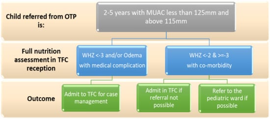 For the SOPs on the nutritional care and clinical management of U5C children with SAM in TFC, special considerations were given to children with moderate acute malnutrition (MAM): admission criteria for MAM cases with infection were adapted based on UNICEF global guidance [38]. Accordingly, in hospitals’ emergency rooms (ER) or outpatient departments (OPD) all children 2–5 years referred from the outpatient therapeutic program with MUAC between 115 and 125 mm would be referred to TFC for further investigations [36,39]. In the TFC, the child is assessed for WHZ and oedema, while applying appropriate IPC measures. The child is admitted if WHZ < −3 or has oedema. The child may also be admitted if WHZ is between −2 and −3, with other co-morbidity. If referral was not possible, a child with MAM using MUAC and WHZ, without the presence of oedema, will receive needed medical care but will not receive F75 and F100 (Figure 2).