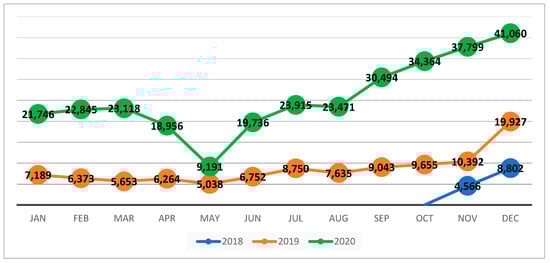 A comparison of the number of children screened within NSS by month in 2018, 2019 and up to December 2020. Abbreviations: NSS: Nutrition Surveillance System.