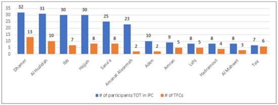 Number of TFCs implementing IPC counseling per governorate and number of participants who participated in training of trainers on IPC. Abbreviations: IPC: infection protection and control; TFCs: therapeutic feeding centers; TOT: training of trainers.