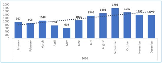 Number of under five children admitted to TFCs in 2020, by month. Abbreviations: TFCs: therapeutic feeding centers.