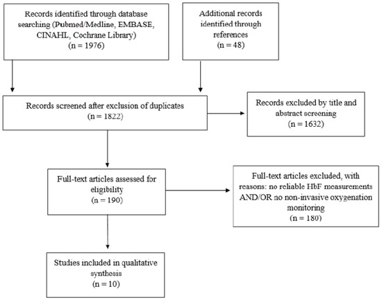 Our initial search identified 2024 articles. After the removal of duplicates, 1822 articles were screened for inclusion. Exclusion criteria included absence of reliable HbF measurements or non-invasive oxygenation monitoring in term or preterm neonates (shown in Figure 2). Ten observational studies fulfilled the inclusion criteria [4,5,6,7,29,30,31,32,33,34]. No randomized controlled trial was identified. All studies performed measurements of HbF and non-invasive oxygen saturation monitoring by pulse oximetry at the upper and/or lower extremity in neonates in the first days and weeks after birth and determined blood oxygenation parameters. The study populations included preterm and term neonates with a range of gestational ages from 24 to 42 weeks of gestation. Studies are presented in Table 1 and Table 2 according to the HbF measurement method.