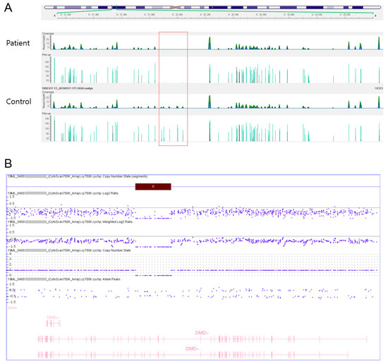 Diagnostic exome sequencing (DES) and CMA were performed together to ensure an accurate diagnosis since the patient was so young and not yet showing clear signs. Before implementing the DES and CMA, we referred the case to a genetic counseling specialist of laboratory medicine to minimize possible ethical issues. We also explained the detailed process of these genetic diagnostic techniques to the patient’s parents before providing written informed consent. For DES, genomic deoxyribonucleic acid (DNA) was extracted from peripheral blood leukocytes using the CheMagic™ Magnetic Separation Module I method (PerkinElmer chemagen, Besweiler, Germany) with the genomic DNA Blood 200 µL Kit. The xGen Inherited Diseases Panel (Integrated genomic DNA Technologies, Inc., Coralville, IA, USA) was used for library preparation, and sequencing was performed on the Illumina NextSeq 500 platform (Illumina, Inc., San Diego, CA, USA), generating 2 × 150 bp paired-end reads. The obtained sequence reads were aligned to the hg19 human reference sequence using the Burrow–Wheeler Aligner (BWA version 0.7.12, http://bio-bwa.sourceforge.net, assessed on 17 June 20). Duplicated reads were removed with Picard tools (version 1.96, http://picard.sourceforge.net). Local realignment, recalibration, and variant calling were performed with the Genome Analysis Tool Kit (GATK version 3.5, Broad Institute, Cambridge, MA, USA) and annotation was performed with Variant Effect Predictor (VEP88), dbNSFP v3.3. Hemizygous deletion of exons 45–50 was detected (Figure 1A). For CMA, genomic DNA was extracted from the peripheral blood. CMA was performed with the CytoScan 750 K Array (Affymetrix, Santa Clara, CA, USA) according to the manufacturer’s recommendations. The platform was composed of 550,000 nonpolymorphic copy number variation probes and more than 200,000 single nucleotide polymorphism probes with an average resolution of 100 kb. All data were visualized and analyzed with the Chromosome Analysis Suite (ChAS, version 1.3.0.46, Life Technologies Ltd., 3 Fountain Drive, Paisley, Scotland, UK) software package (Affymetrix) using hg19 human genome build. As a result, the patient’s microarray profile showed a hemizygous deletion of ~240 kb (31795774_32036509) in the chromosome region Xp21.1 (Figure 1B).
