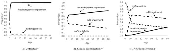 While it is unlikely for individuals with PKU today to be untreated, we included a submodel that represents the natural history of PKU (untreated) for the development of the intervention strategy submodels. The natural history submodel included four health states for individuals with PKU: no/few deficits, mild impairment, moderate/severe impairment, and dead (Figure 1). The health states are not defined by Phe level but are correlated with the level of impairment. Some simplifying assumptions were made: (1) once individuals have transitioned to a worse health state they cannot return to a better state, and (2) individuals must pass through intermediate health states to transition to a more severe state. We assume the health states of the individuals with PKU are evaluated every year in the model, i.e., model cycle length is one year. The lifetime trajectories through health states of these submodels are shown in Figure 2 (and Figure S1). Probability inputs were derived from published literature and supplemented by expert opinion [,].