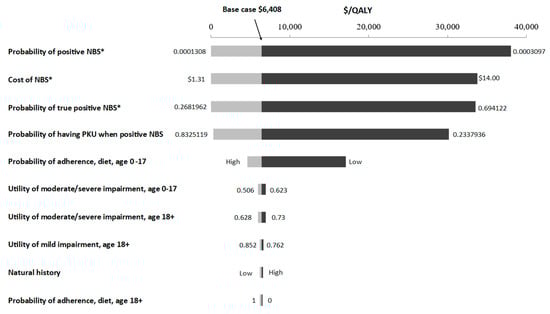 One–way sensitivity analysis for NBS/diet when compared with CI/diet, ICER. * For these variables, when the value decreased to a certain threshold, the reference case switched to NBS/diet and becomes a cost–saving strategy when compared to CI/diet the ICER is negative with NBS/diet as reference case, therefore, 0 is used here to indicate that NBS/diet is the more cost–effective strategy when the value is lower, i.e., when the cost of NBS decreases, when the probability of NBS screened positive decreases, and when the probability of true positive decreases, all these would turn NBS/diet to a more favorable strategy.
