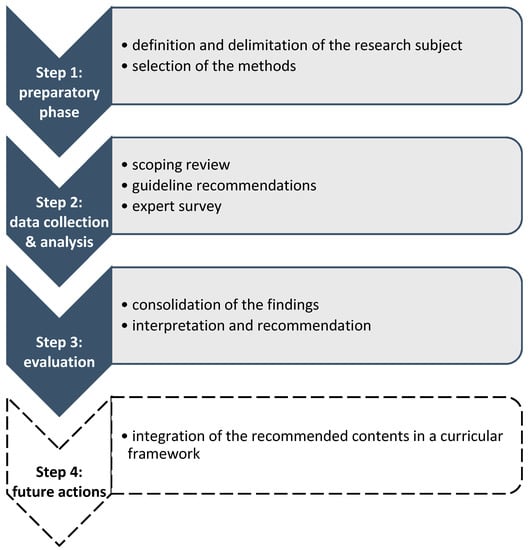 Curricula should implement contents with high relevance regarding this educational topic. Therefore, a decision was made to focus this study on the derivation of appropriate topics for a pediatric pain curriculum using a scoping review, guideline recommendations and an expert survey. This developmental study was performed, following the principles of the educational design research [18]. The different steps of the study are depicted in Figure 1 and described in depth in this section. Step 4 presents possible actions for the future.