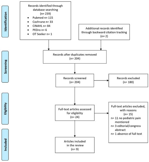 The literature search delivered 239 records; two additional records were identified through backward citation tracking (Figure 2). After removing duplicates, 204 records were screened from which 180 were excluded because they did not meet the inclusion criteria. After assessing the full texts of the remaining 24 articles, another 15 articles were excluded with reasons (n = 11 no pediatric pain mentioned, n = 3 editorial or congress abstract, n = 1 absence of full text). Finally, nine articles published between 2001 and 2020, fulfilled the inclusion criteria and were taken into account in the analysis [33,34,35,36,37,38,39,40,41]. An update of the literature search on 27 April 2021 in Medline, Cochrane, CINAHL, PEDro and OTSeeker databases delivered no new relevant records.