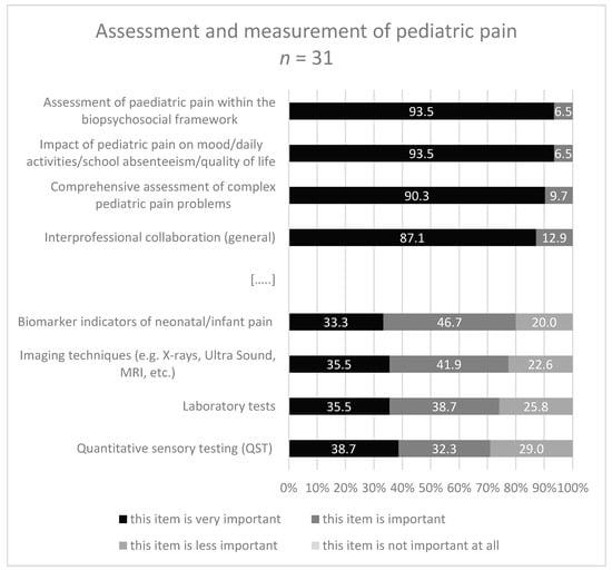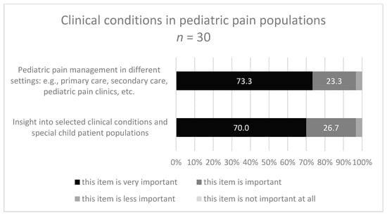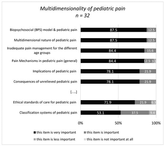 The contents with the highest percentage in the category ‘very important’ were ‘the biopsychosocial model and the multidimensional nature of pediatric pain’ (both 87.5%). Further ratings within the multiple, divergent response categories are illustrated in Figure 2 with regard to the most and least important items, respectively.