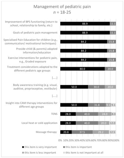 Second, it was not compulsory to answer all the questions, the respondents (n = 45) could skip some questions of the survey. This resulted in varying numbers of responders on the questions regarding covering of items in the curricula or importance of our proposed contents. Although our results focused mainly on chronic pediatric pain, the prevention of pain and timely interventions for acute pain in children should certainly not be ignored. Pain experiences in childhood can make children vulnerable to chronic pain in adulthood [5]. Non-pharmacological interventions are effective in the prevention of pediatric pain and exercise/physical activity (PT and OT) find their rightful place in the treatment of acute pain [67,68].