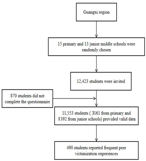 Data of the current study came from the survey of primary and junior high schools in GYMHS. A total of 11,553 students (3161 from primary school [senior pupils over nine years old] and 8392 from junior school) completed the survey and consisted of the analytical sample, at a response rate of 93.9%. Four hundred and ninety students (comprising 4.2% of all respondents) replied positively to the item in the Adverse Childhood Experience Scale-Revision that ascertained whether a respondent had been subject to an FPVE before 18 years old. In other words, the item asked whether the respondent had been frequently or very frequently abused by other children (including siblings) verbally or physically [37]. These respondents were selected for further statistical analysis in this study. The procedure of sampling and participant recruitment is presented in Figure 1. To maximize the effectiveness of self-report, the anonymity and confidentiality of all participants were guaranteed. The Shenzhen University Ethics Committee approved this research project (no. 2020005).