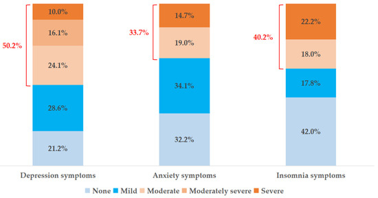 The Mean and SD of depression, anxiety, and insomnia symptoms among adolescents with FPVEs were 10.51 ± 6.70, 7.74 ± 5.17, and 23.08 ± 8.13, respectively. Regarding the prevalence of depression, 21.2% reported minimal depression symptoms, while 28.6%, 24.1%, 16.1%, and 10.0% of participants reported mild, moderate, moderately severe, and severe depression symptoms, respectively. As for anxiety symptoms, 32.2% of participants showed minimal anxiety symptoms, while 34.1, 19.0%, and 14.7% of participants reported mild, moderate, and severe anxiety symptoms, respectively. Regarding insomnia, 42.0% of participants showed minimal insomnia symptoms, whereas 17.8%, 18.0%, and 22.2% had mild, moderate, and severe insomnia symptoms. In summary, 50.2% (PHQ-9 ≥ 10), 33.7% (GAD-7 ≥ 10), and 42.0% (YSIS ≥ 26) of adolescents were screened positively on depression, anxiety, and insomnia, respectively, based on the recommended cutoff point. Further information is presented in Figure 2.