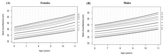 Neck circumference was greater for the male than for the female participants, and it showed an age-dependent increase. The age group with the smallest increment was for children between 6 and 7 years old, whereas the most pronounced increment was for children between 10 and 11 years old for both sexes. This increment might be related to the onset of puberty, which normally begins at 10–11 years and 13–14 years for girls and boys, respectively. Most importantly, female participants had the greatest yearly increment, regardless of age, for neck circumference, waist circumference, and body fat percentage. This finding represents relevant evidence of the association between neck circumference and adiposity indicators in this gender.