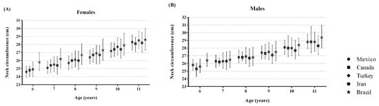 On the other hand, Coutinho’s report [34] on Brazilian children showed higher values at the 50th percentile compared to those in our study. This difference was more notable for girls 6–8 years of age (0.3–1.2 cm). For boys, the difference was less (0.1–0.6 cm). However, these percentiles were calculated based on children with NC values within ±3 SD. A graphical comparison between the 25th, 50th and 75th percentiles for NC data from the aforementioned countries is shown in Figure 2.