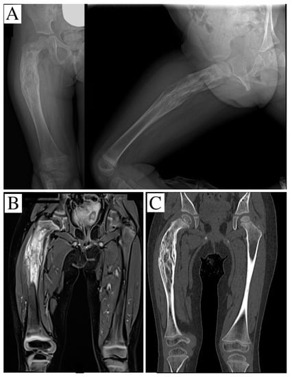 (A) an X-ray showing an osteolytic and apparently well-defined lesion of the proximal and middle third of the right femur; the segment is bent with onion-skin periosteal reaction; (B) STIR-weighted coronal-MRI reconstruction, evidencing permeative behavior and an intense edema. (C) CT scan showing the geographic osteolysis.