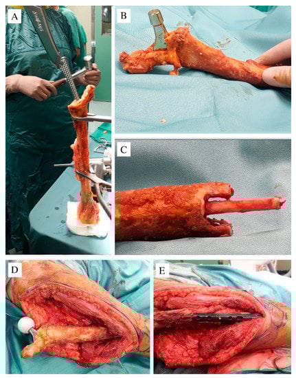 - Campanacci, L.; Alì, N.; Casanova, J.M.P.S.; Kreshak, J.; Manfrini, M. Resurfaced allograft-prosthetic composite for proximal tibial reconstruction in children: Intermediate-term results of an original technique. J. Bone Jt. Surg. Am. Vol. 2015, 97, 241–250. [Google Scholar] [CrossRef]