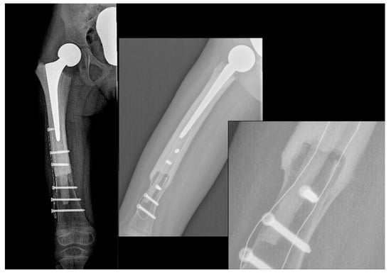 Moreover, the carbon fiber plate may facilitate osteointegration because it stabilizes the segments in a more elastic manner than a titanium plate does; its radiolucency makes it possible to monitor graft fusion, and should ensure safer postoperative radiotherapy, due to the lower level of artifacts, if this is necessary [,]. The aim of overlapping the proximal plate edge and femoral stem is to prevent stress fractures of the graft by improving the load distribution.