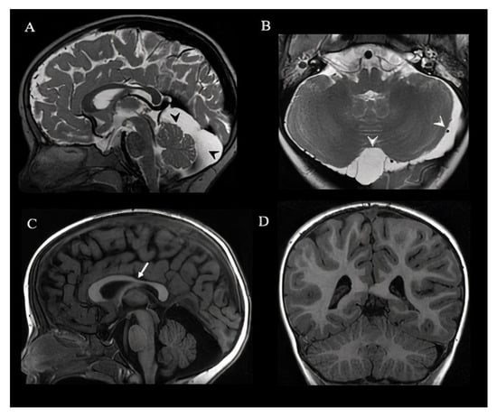 Brain MRI of a 3.5-year-old girl. Sagittal (A) and axial T2 weighted images (B) show enlarged retrovermian cistern and left pericerebellar subarachnoid space (black and white arrowheads). Sagittal T1 weighted image (C) shows thinning of the isthmus of the corpus callosum (white arrow). Sagittal (A,C) and axial (D) images show a normal conformation of the cerebellar hemispheres and vermis. MRI remained unchanged in comparison with the previous one performed at the age of 2.4 years old, except for a progression of the myelination.