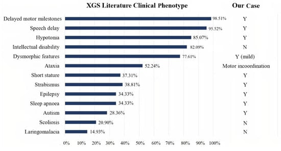 Bar graph showing XGS clinical phenotypes in 67 patients from the literature. Comparison between literature data (on the left), and our case (on the right). Y: yes. N: not present.