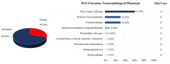 Qualitative analysis of the 18 papers included in our review showed that a sufficiently detailed description of the clinical phenotype was available for 67 patients, information on neuroimaging normality or abnormality was available for 63 patients, and a detailed description of the neuroradiological phenotype was available for 31 patients. The clinical presentation of the 67 XG patients reported in the literature was heterogeneous, with high rates of neurodevelopmental problems/disorders (speech delay, motor delay, and intellectual disability), as well as hypotonia, facial dysmorphisms, and ataxia. In addition, other less frequent features were observed (see Figure 3). Autism was described in only 28.36% of cases. Analysis of the 63 patients, of whom at least one brain MRI was available, revealed altered structural neuroimaging in 70% of patients: thinning of the corpus callosum, posterior fossa abnormalities, and brain atrophy were the main neuroradiological findings reported (Figure 4).