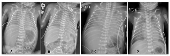 Progression of chest X-ray in the first two weeks after birth. (A). Chest X-ray soon after birth demonstrated low lung volumes and air bronchograms from hyaline membrane disease. (B). Chest X-ray at 48 h of age demonstrated better lung expansion after three doses of intratracheal surfactant administration. (C). The infant was in hypoxic respiratory failure, requiring 100%O2 on day 5 after birth. Chest X-ray revealed significant bilateral opacities with low lung volumes. (D). A dexamethasone course significantly improved lung aeration, with decreasing lung opacities on day 12 after birth.