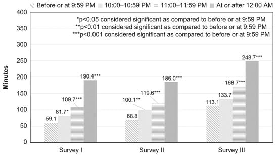 The results of comparisons of average minutes of daily internet use by bedtime on holidays between the surveys are shown in Figure 2. In all surveys, the participants who went to bed later on holidays had longer average internet use times. The average internet use time in survey III was longer than the averages in the other surveys at all bedtime hours.