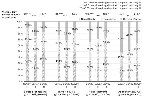 The results of comparisons of average minutes of daily internet use by bedtime on weekdays between the surveys are shown in Figure 1. In all surveys, the participants who went to bed later on weekdays had longer average internet use time. The average internet use time in survey III was longer than the averages in the other surveys at all bedtime hours.