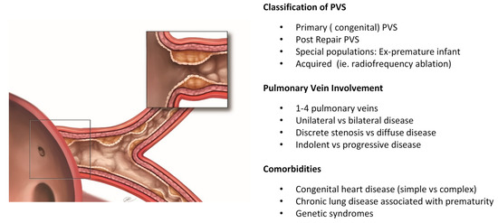PVS can be classified as ‘primary PVS’ (or congenital), whereby the veins are normally connected to the left atrium, or ‘post repair PVS’, where the pulmonary veins drained anomalously, and PVS develops after veins have been surgically connected to the left atrium [1]. An important special population are children who are ex-premature and develop PVS, as their disease trajectory and comorbidities may be unique [2]. One could also add in-stent stenosis as another potential subcategory, where the etiological mechanism of stenosis (mitogenic stimulus due to radial forces) may be different from the original PVS that was treated by the stent. ‘Acquired’ PVS describes PVS caused by other factors such as radiofrequency ablation and fibrosing mediastinitis.