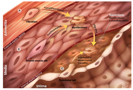 The origin of the myofibroblast-like cells is currently an area of investigation and is an area where many potential therapeutic adjuncts are emerging. Myofibroblast cells that characterize neointimal lesions can come from many different sources and may have temporal contributions over different stages of lesion development (Figure 2). Potential sources of cells could be through proliferation of existing pericytes and fibroblasts in the various vascular compartments, endothelial-to-mesenchymal transition, dedifferentiation of smooth muscle cells and circulating progenitor cells.