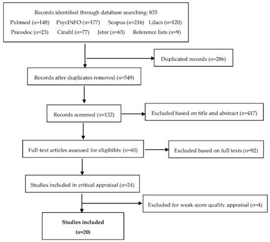 The initial electronic search yielded 835 references, from which 286 were duplicates. After reading the title and abstract, 417 references were excluded, as they did not meet the inclusion criteria. Then, 132 full text articles were screened, and 92 were excluded because the full text article did not report any relationship between couple dyadic adjustment and family health. Finally, a set of 24 full text articles were potentially relevant for eligibility.