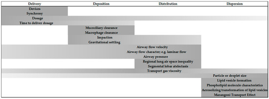 Aerosolized surfactant confronts unique challenges, overcoming deposition in the upper airways and being distributed to the deepest segments of the lung and effectively dispersed within gas-exchanging alveolar tissues. A considerable portion of a delivered therapeutic surfactant dosage is known to be lost before a sufficient amount descends below the alveolar ducts. As little as 1% to 14% of a dosage has been reported to reach the most distal lung parenchyma [25,26]. However, a more recent report using a newborn piglet model introduced atomization rather than nebulization [27]. Their investigational system is a multilumen flexible catheter capable of delivering low airway flow simultaneously with intermittent delivery of surfactant. The median particle size was 40–60 μm. Despite the larger particle size, they demonstrated that 40% of the surfactant is distributed by scintigram in the distal lung regions. They achieved a remarkable supraglottic delivery that overcomes tracheal and large bronchial airway losses to deposition yet provided bilateral lung distribution and alveolar space dispersion. To meet the challenges of surfactant delivery as an aerosol, animal data and in-vitro models have revealed considerable insight into the potential for it to become an effective therapeutic agent. Multiple variables have been determined that provide guidelines for translational considerations in the development and clinical application of aerosolized surfactant for infants (see Figure 1).