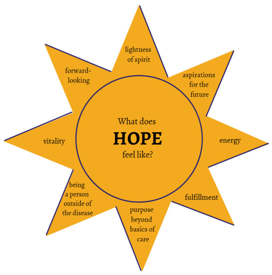 Participants described what hope meant to them (Figure 1). They described how the term “hope” was associated with the experience of having aspirations and purpose because this allowed them to feel like they were “a person outside of the disease” and provided something to look forward to. They identified the feeling of vitality and lightness of spirit, which they felt allowed for energy to apply towards their goals and a way of being that allowed for them to “unbury” interests and passions.