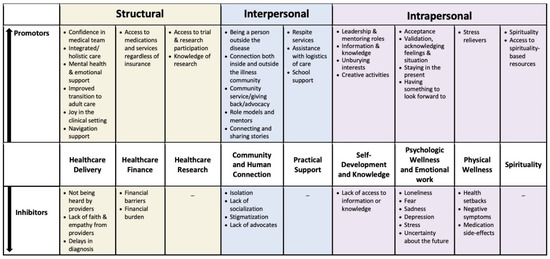 Within the three levels of socioecological influence (i.e., structural, interpersonal, and intrapersonal), patients and caregivers described numerous factors that either promoted or inhibited hope (Figure 2 and Table S1). The number of factors of greatest importance varied within and across level of influence and domain. The largest number of examples were provided by participants for the domains of healthcare delivery, community and human connection, and psychological and emotional well-being. The patients and caregivers did not provide specific examples of inhibitors within the domains of healthcare research, practical support, or spirituality.