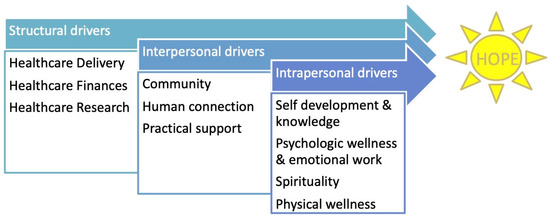 Figure 3 depicts the final conceptual model of hope, with three main pathways to hope, based on structural, interpersonal, and intrapersonal levels of influence. The structural level included domains related to healthcare delivery, healthcare finance, and healthcare research. The interpersonal level included domains related to community and human connection and practical support, and the intrapersonal level included domains related to self-development and knowledge, psychological wellness and emotional work, physical wellness, and spirituality.