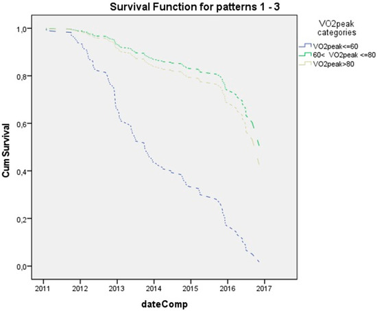 We observed that patients with 60 < VO2peak < 80% predicted at some points presented less possibility than those with VO2peak > 80% predicted, a finding that comes as a surprise and to our knowledge could not be attributed to anything. However, it must be noted that there is no statistically significant difference between the two as is to the first category of VO2peak < 60%.