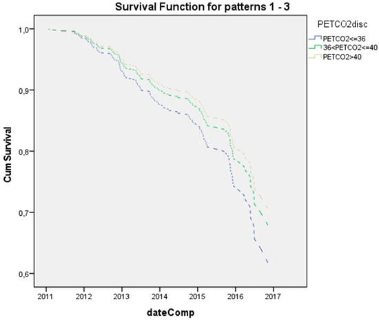 Similarly, the patients were divided into 3 groups according to their VE/VO2 and PETCO2, to assess them as a predictor of exacerbations.