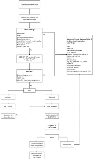- Taddio, A.; Ferrara, G.; Insalaco, A.; Pardeo, M.; Gregori, M.; Finetti, M.; Pastore, S.; Tommasini, A.; Ventura, A.; Gattorno, M. Dealing with chronic non-bacterial osteomyelitis: A practical approach. Pediatr. Rheumatol. 2017, 15, 1–8. [Google Scholar] [CrossRef]