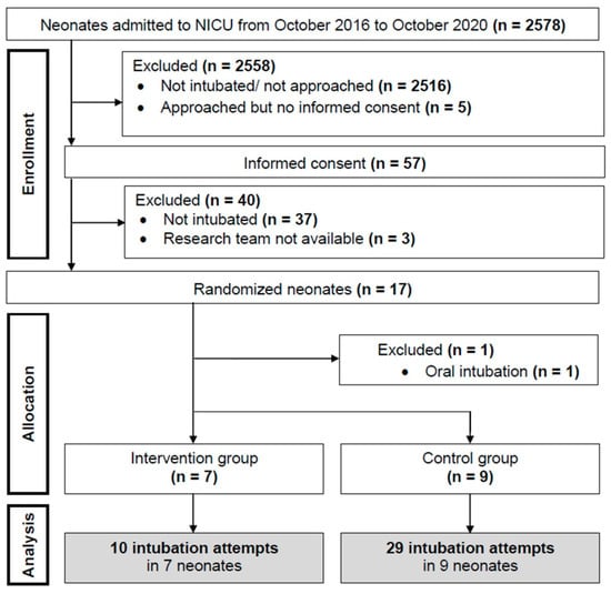 The nasopharyngeal route for intubation was used according to the standard procedure. Infants routinely received 1 mg/kg Propofol (Fresenius Kabi, Bad Homburg vor der Höhe, Germany) intravenously for sedation shortly before intubation. Propofol application could be repeated if needed. In the intervention group, the Neopuff Infant T-Piece Resuscitator (Perivent, Fisher& Paykel Healthcare; New Zealand) was connected to the ETT with the default settings of positive-end expiratory pressure of 5 cmH2O and gas flow of 6 L/min ≤ 1000 g, 7 L/min between 1000 and 2000 g, or 8 L/min > 2000 g birth weight. The fraction of inspired oxygen was adjusted for each patient during non-invasive mask ventilation prior to intubation, aiming for a target peripheral arterial oxygen saturation (SpO2) of >89%. Continuous gas flow was provided through the ETT by an assisting staff member from insertion of the ETT into the nose until the ETT passed through the vocal cords. Once the ETT was placed in the trachea, continuous gas flow was discontinued and the ventilator was connected to start positive pressure ventilation (PPV). In the control group, no continuous gas flow was provided during intubation. Auscultation and/or exhaled carbon dioxide detection was used to assess correct ETT position. The duration of each intubation attempt was defined as the time from the removal of the face mask until the confirmation of correct ETT placement and was measured by a study team member using a stopwatch.