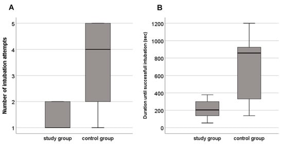 Boxplots of (A) number of intubation attempts and (B) duration until successful intubation in neonates intubated with the novel intubation method (study group) and the conventional intubation method (control group).