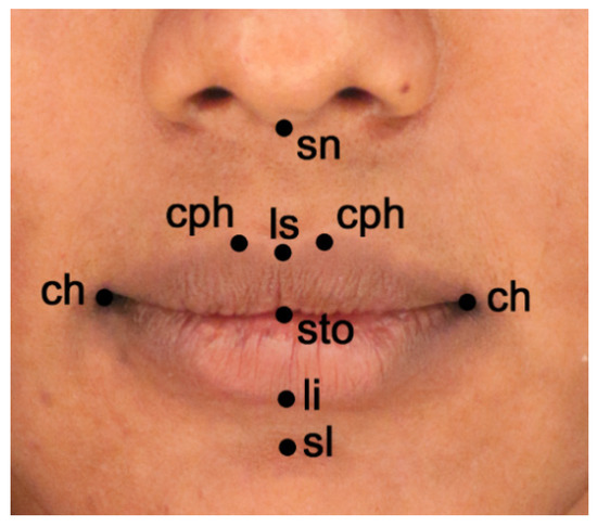 The same data collection procedure from our previous investigations was used, as detailed elsewhere [31,32,42,43]. By using a portable hand-held laser scanner (FastSCAN Cobra; Polhemus Inc., Colchester, VT, USA), 3D facial surface images of the subjects were recorded. A single operator acquired the facial image of all the subjects. Offline, the facial models were visualized by using an interactive 3D modeler software (Rhinoceros NURBS modeling for Windows 4.0) and the x, y, z coordinates of a standardized set of 50 soft tissue landmarks were obtained. Subsequently, custom computer programs were used for anthropometric measurements [32,40,43,44]. A subset of the collected landmarks was employed in the current study (Figure 1): sn, subnasale; ls, labiale superius; sto, stomion; li, labiale inferius; sl, sublabiale (midline unpaired landmarks); cph, crista philtri; ch, cheilion (on the right-r and left-l side of the face or paired landmarks).