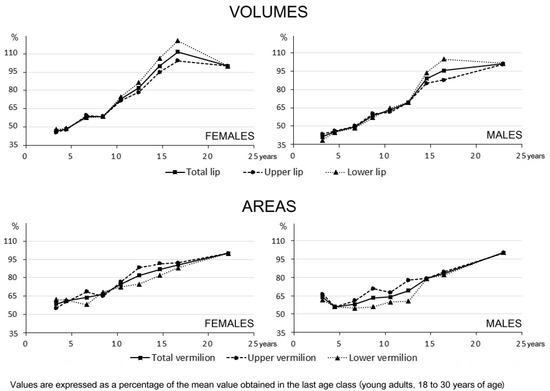 In both sexes, vermilion areas grew faster than lip volumes during childhood, while the pattern reversed after 10 years of age. The vermilion areas were surprisingly larger in the first male age group than in the two subsequent ones. It must be pointed that the number of analyzed boys was limited in that age group; furthermore, outlier values were observed.