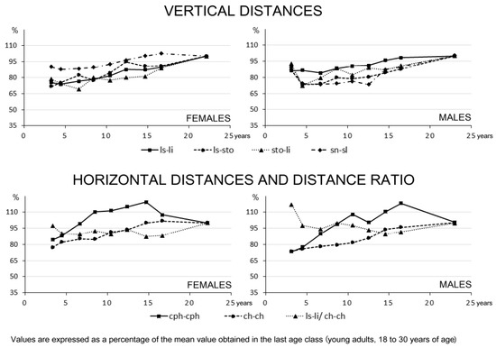 Figure 2 and Figure 3 show the age-related modifications of the analyzed measurements in the two sexes. Data are expressed as a percentage of the attainment of adult dimensions; values greater than 100% may be accounted for in the cross-sectional design of the study.