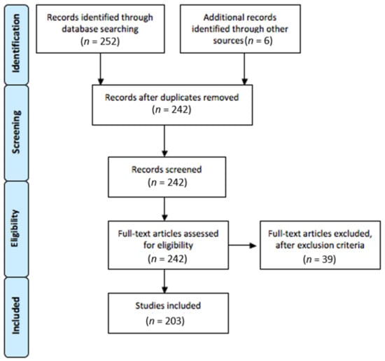 The initial search led to 258 studies. After removing the 16 duplicates, 242 were screened. Thirty-nine were excluded because they did not meet the inclusion criteria. Finally, 203 full text articles were considered for the analysis. Appendix Table A1 lists the empirical studies included in the scoping review, and the full database can be found in the (Supplementary Material Table S1). For each study, we obtained the following information: