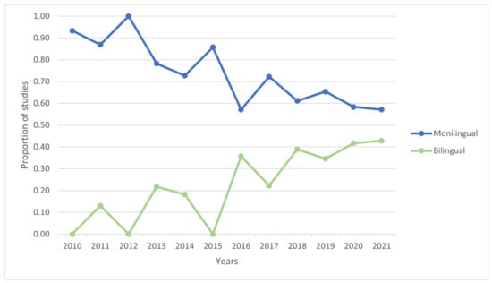 Proportion of monolingual and bilingual studies published between 2010 and 2021.