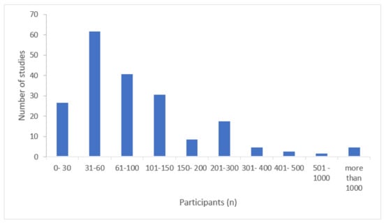 Sample size varies from 5 participants to 2212. However, almost 80% of the studies included samples of fewer than 150 participants, and 64% included 100 participants or less. Figure 3 shows the number of studies according to sample size.